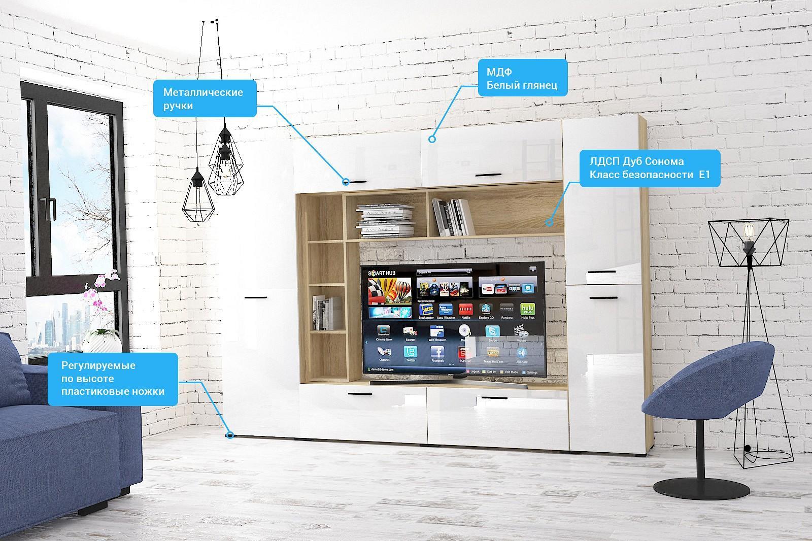 Гостиная сделана из ЛДСП класса Е1 ведущего европейского производителя, фасады из экологичного МДФ, покрыты ПВХ глянцевой пленкой.