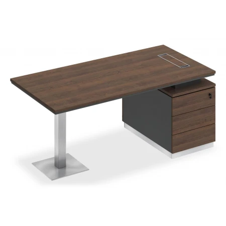 Стол состоит из столешницы, заглушки кабель-канала, металлической опоры и опорной тумбы.