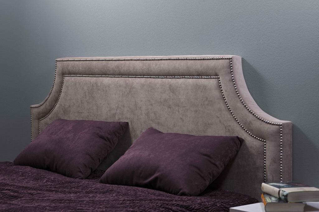 Бархатное изголовье из микрофибры в приглушенной гамме серо-коричневого цвета не будет требовать соблюдения какого-то определенного стиля в интерьере спальни, но позволит наслажаться уютом и затишьем в комнате, предназначенной для отдыха. Обивка из нежной ткани крепится к фигурному изголовью при помощи строчки из мебельных гвоздиков. Их тусклый блеск поддержан фурнитурой остальных предметов спального гарнитура.