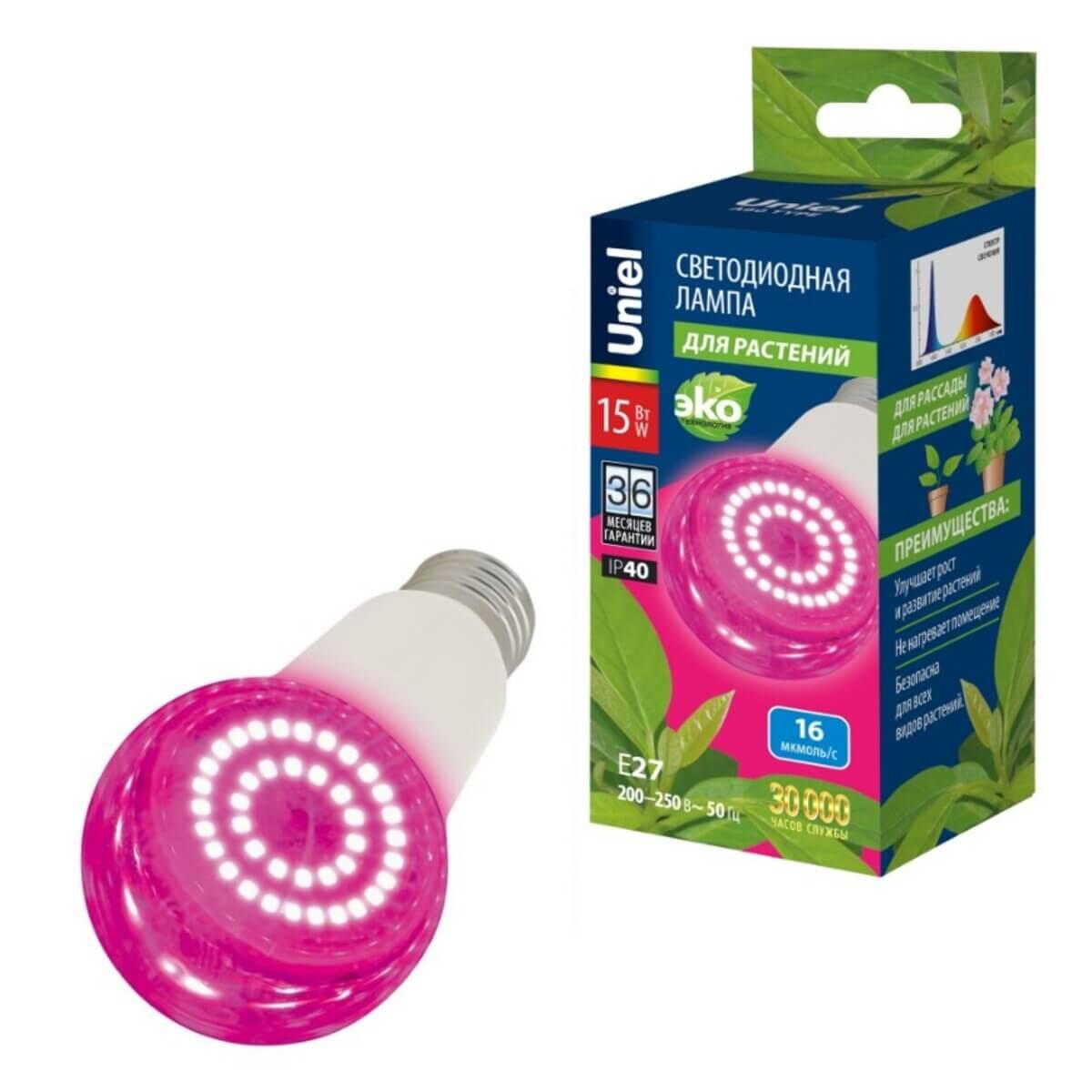 Лампа светодиодная для растений Uniel E27 15W прозрачная LED-A60-15W/SPSB/E27/CL PLP30WH UL-00010107