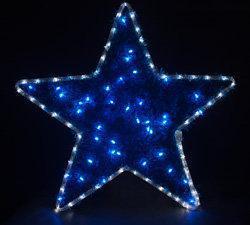 Светящаяся фигура в виде звезды на металлическом каркасе, к которому прикреплены, с помощью стяжек, светодиодный дюралайт, с белым цветом свечения, и гирлянда с мишурой, с синим цветом свечения. Свечение статичное. Световая фигура применяется как в уличных условиях, так и внутри помещений для оформления витрин магазинов, окон и фасадов здания.